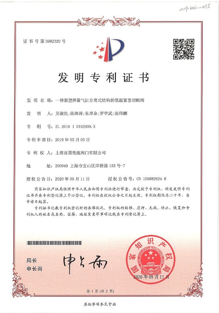 发明专利-一种新型弹簧气缸分离式结构的低温紧急切断阀