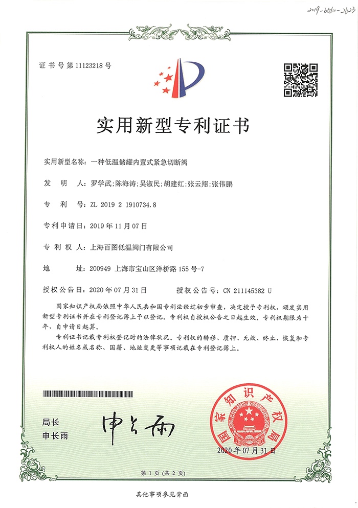 实用新型专利-一种低温储罐内置式紧急切断阀